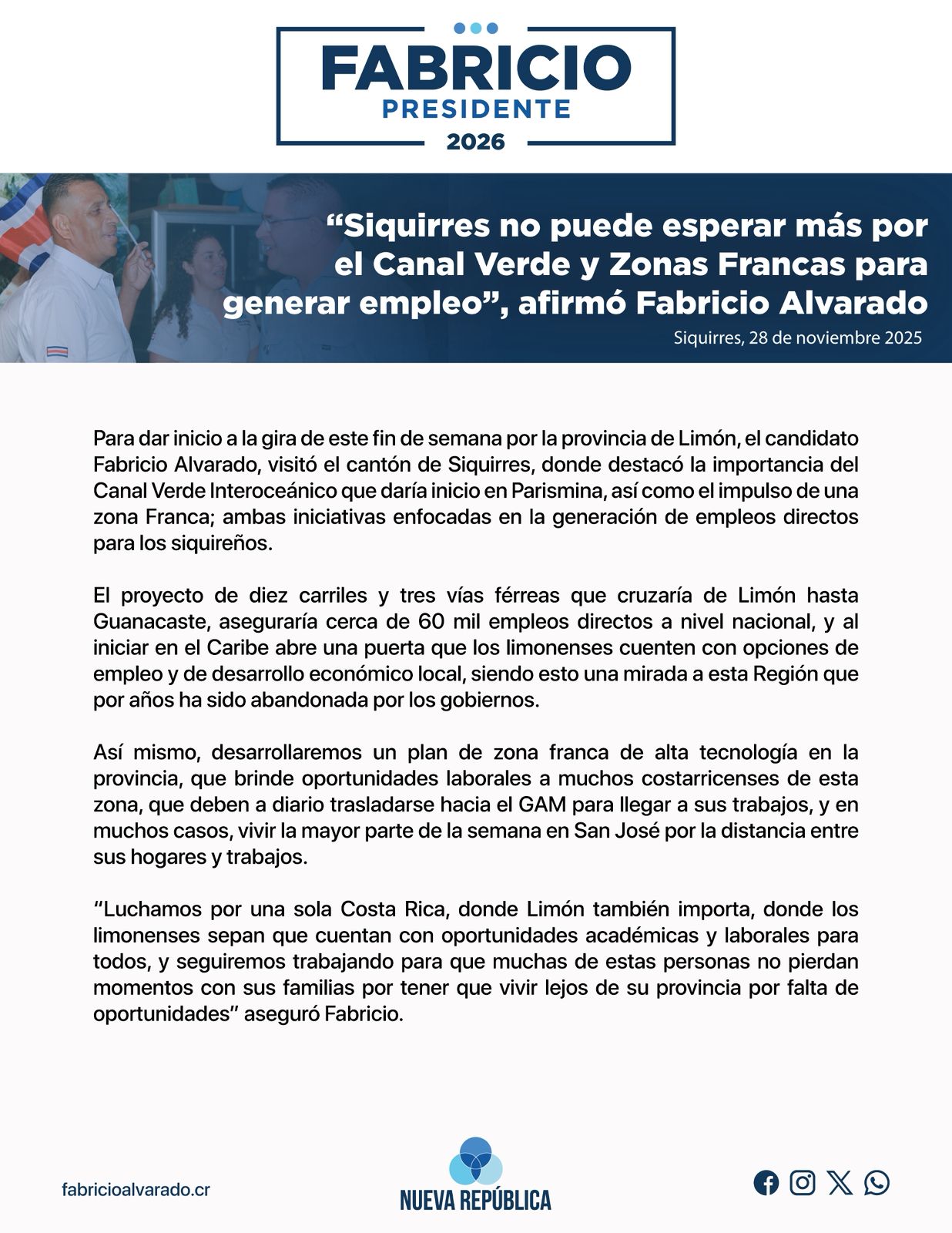 Para dar inicio a la gira de este fin de semana por la provincia de Limón, el candidato Fabricio Alvarado, visitó el cantón de Siquirres, donde destacó la importancia del Canal Verde Interoceánico que daría inicio en Parismina, así como el impulso de una zona Franca; ambas iniciativas enfocadas en la generación de empleos directos para los siquireños.